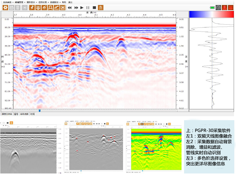 實時處理:背景去除,濾波,增益調(diào)節(jié);自動管線識別;雙頻數(shù)據(jù)融合